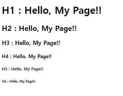 <h></h> 태그는 뒤에 숫자를 넣을때 마다 글자의 크기가 달라지는데 크기는 다음과 같다.